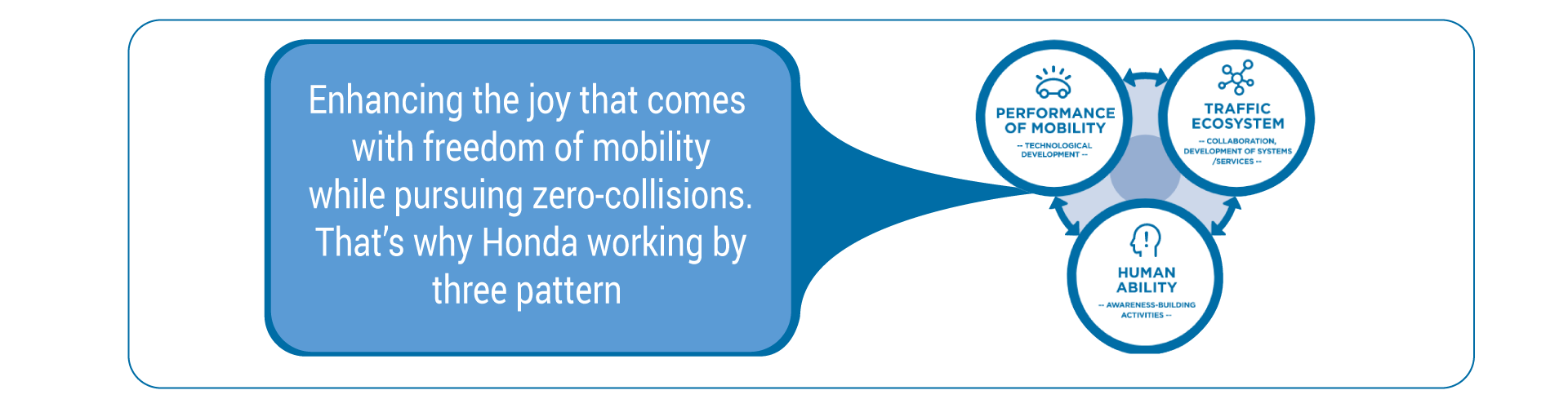 Some people may think, “Doing nothing is the safest choice.”But the safety Honda is pursuing is the “safety which enables people to spread their wings.”In order to realize a collision-free society where everyone can follow their curiosity and go anywhere freely with total peace of mind,Honda is pursuing safety in view of three components of safety-human ability, mobility performance and the traffic ecosystem.