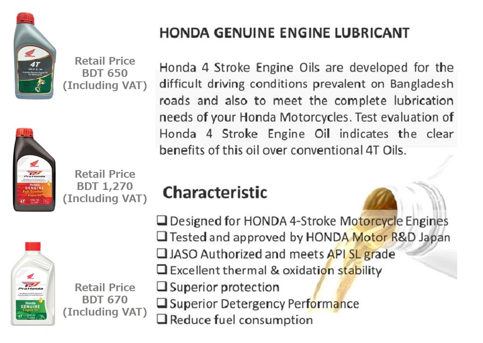 Honda 4 Stroke Engine Oils are premium quality engine oils Tested by Honda R&D (Japan). They conform to international specifications of JASO (Japanese Automobile Standard Organization) MA. Honda 4 Stroke Engine Oils have been developed keeping in mind the difficult driving conditions prevalent on Bangladesh roads. To meet the complete lubrication needs of your Honda Motorcycles we strongly recommend that you use Honda 4 Stroke Engine Oils only. Test evaluation of Honda 4 Stroke Engine Oil indicates the clear benefits of this oil over conventional 4T Oils.